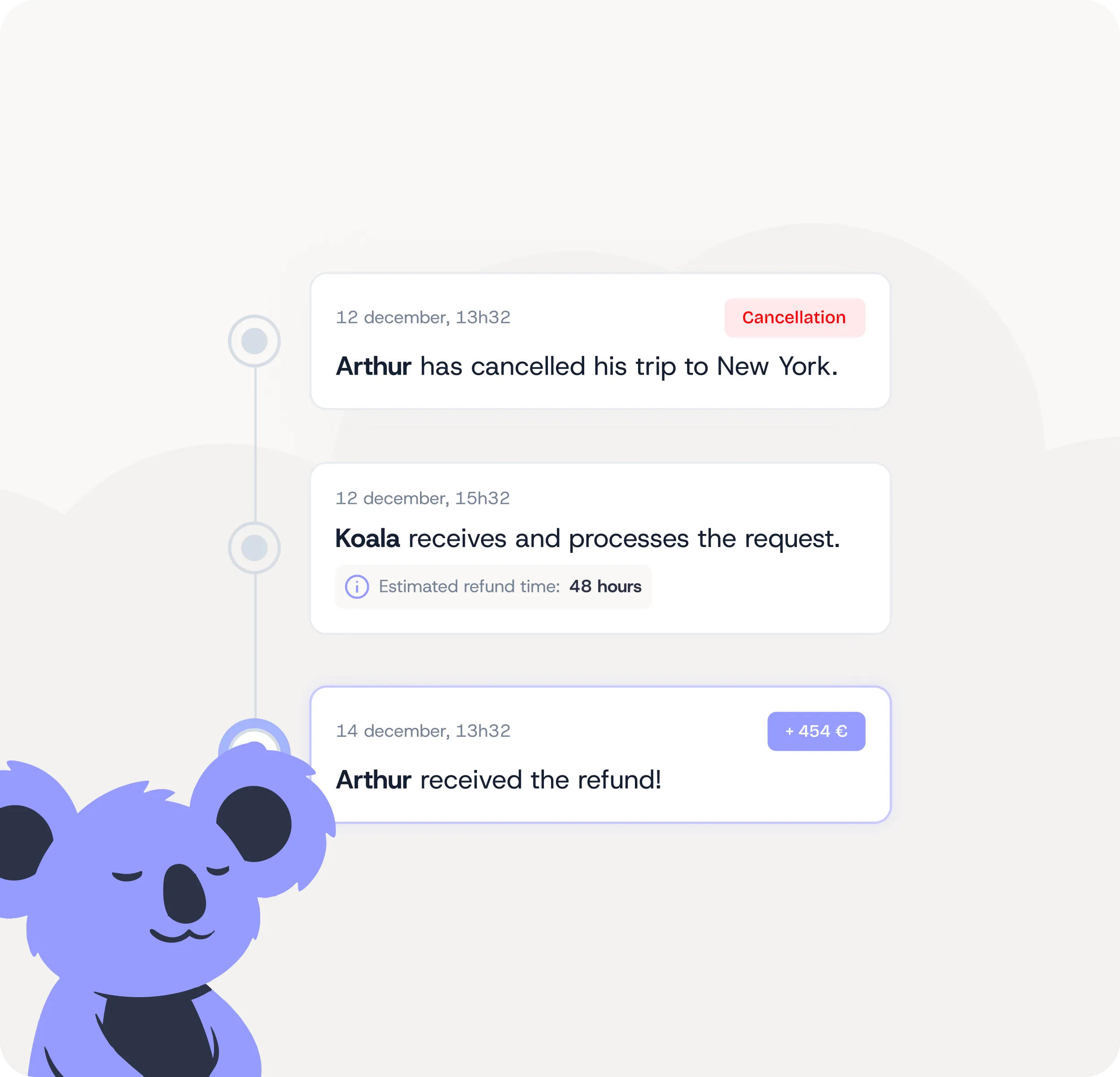 Refunds hit your customer's account within 48 hours - directly from Koala, or from you if using white-label. Fast, seamless, and stress-free.