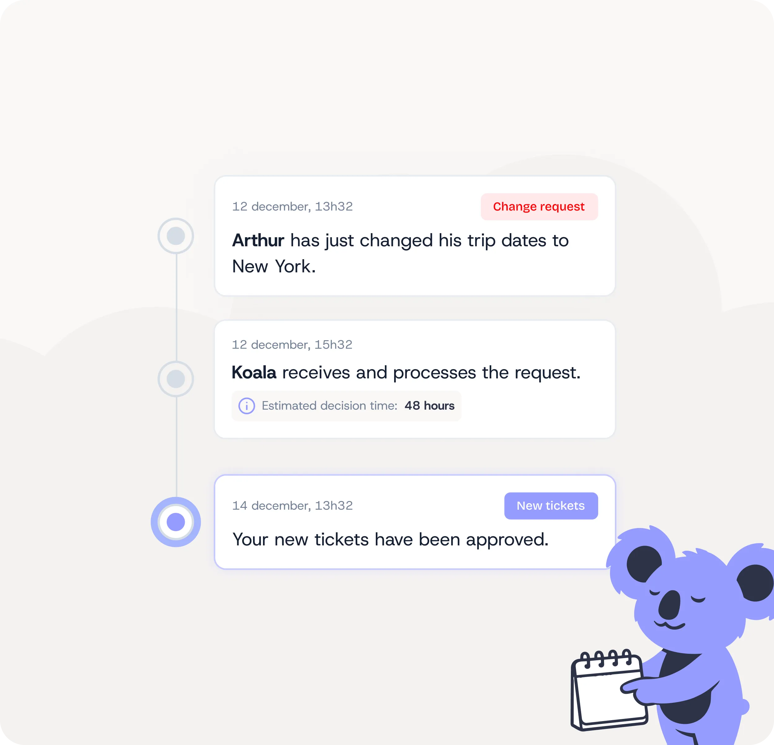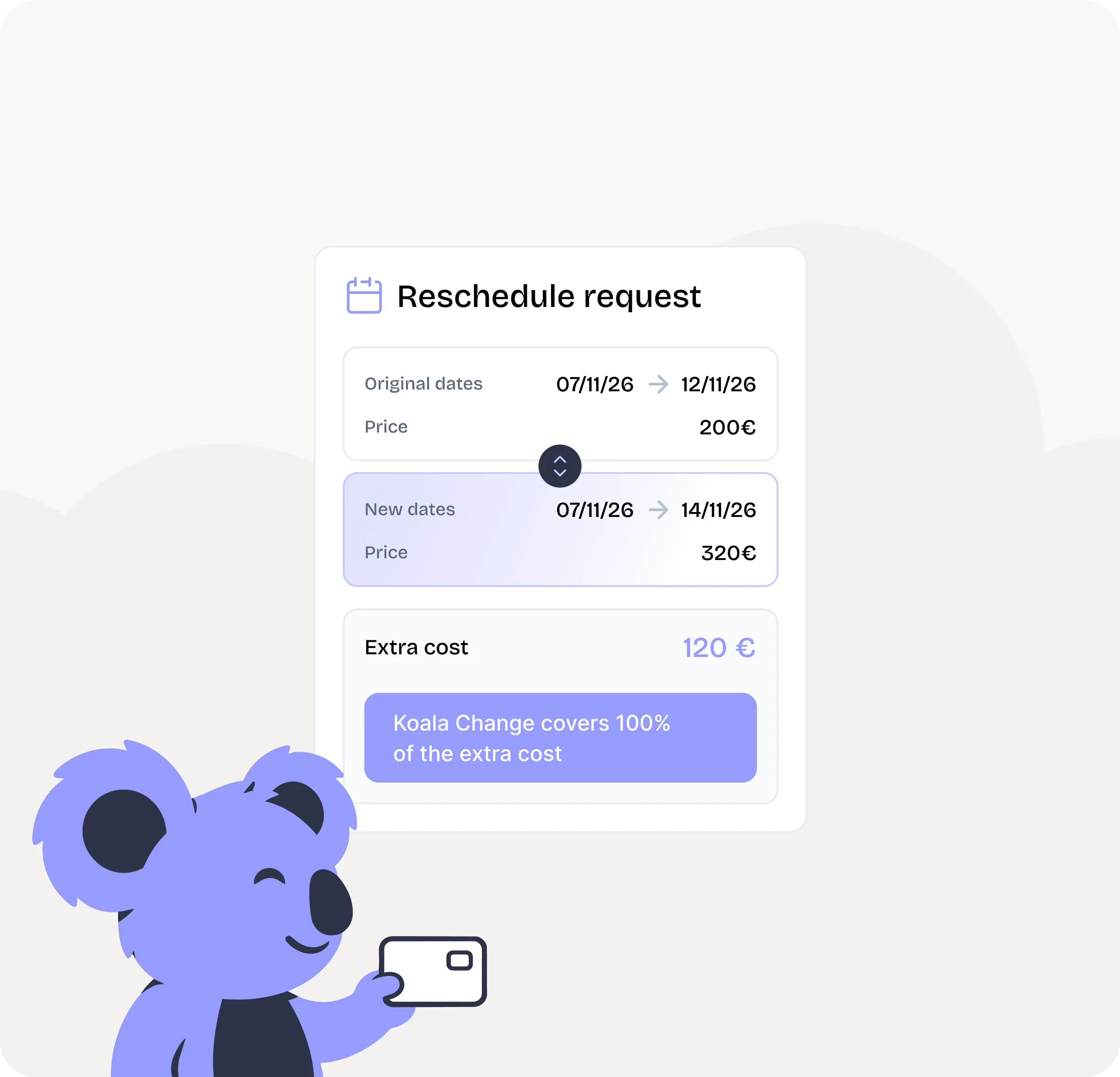 You reissue the tickets, while Koala covers part or all of the change cost. We reimburse you on a rolling basis - clear, smooth, and frictionless.