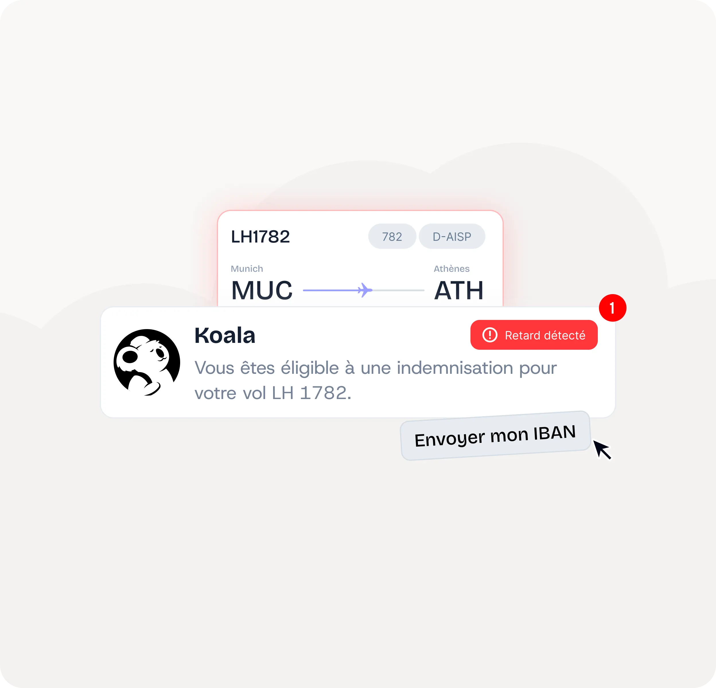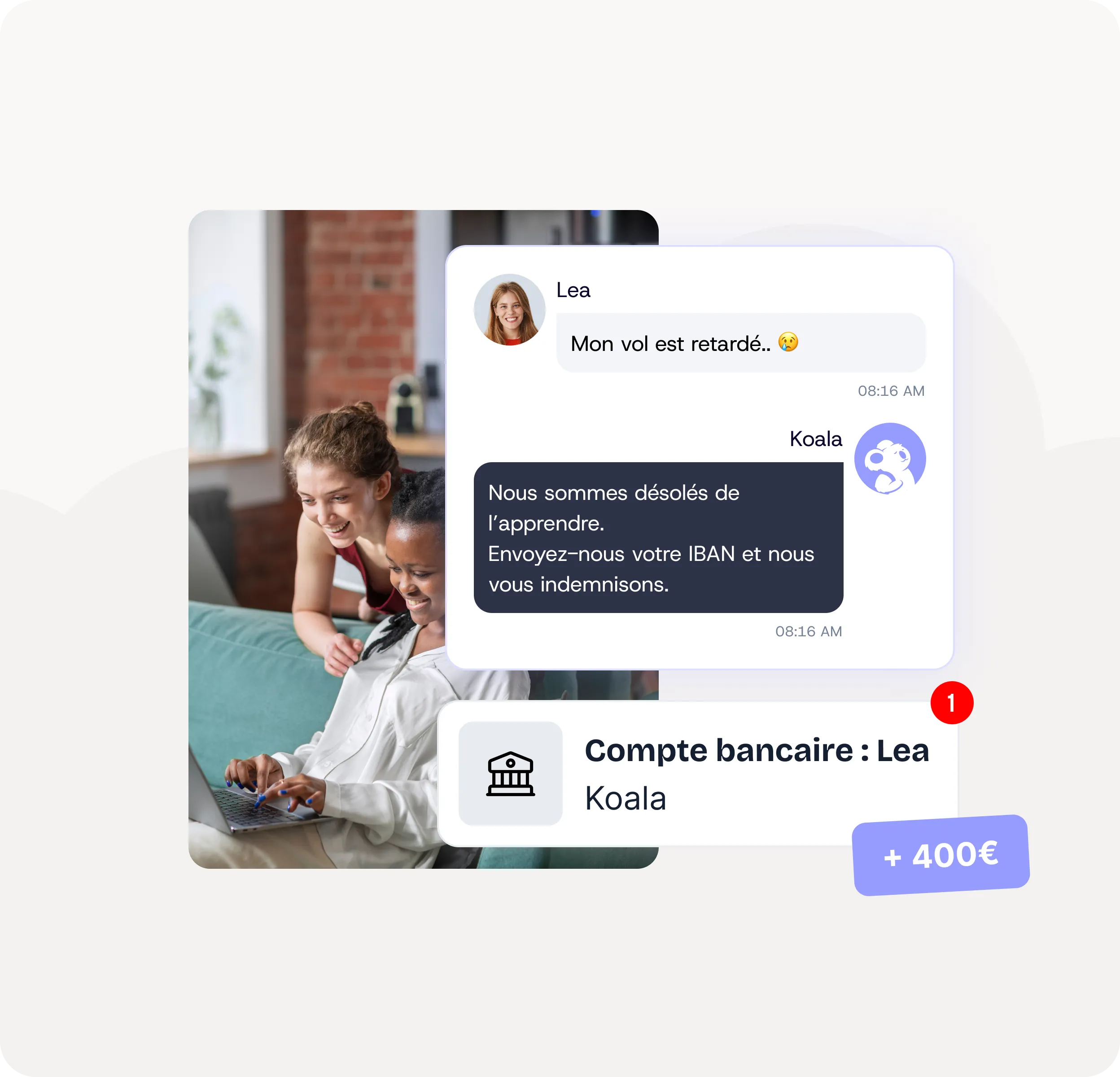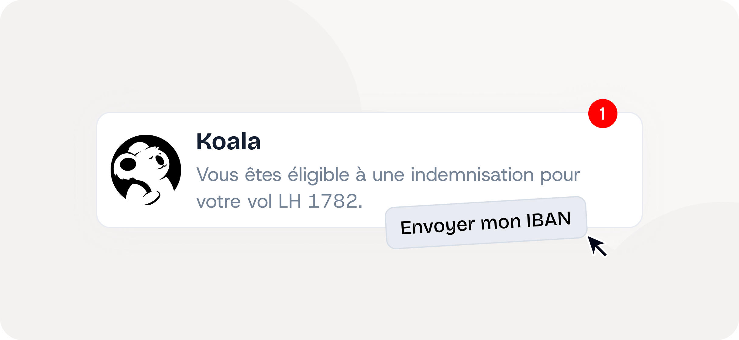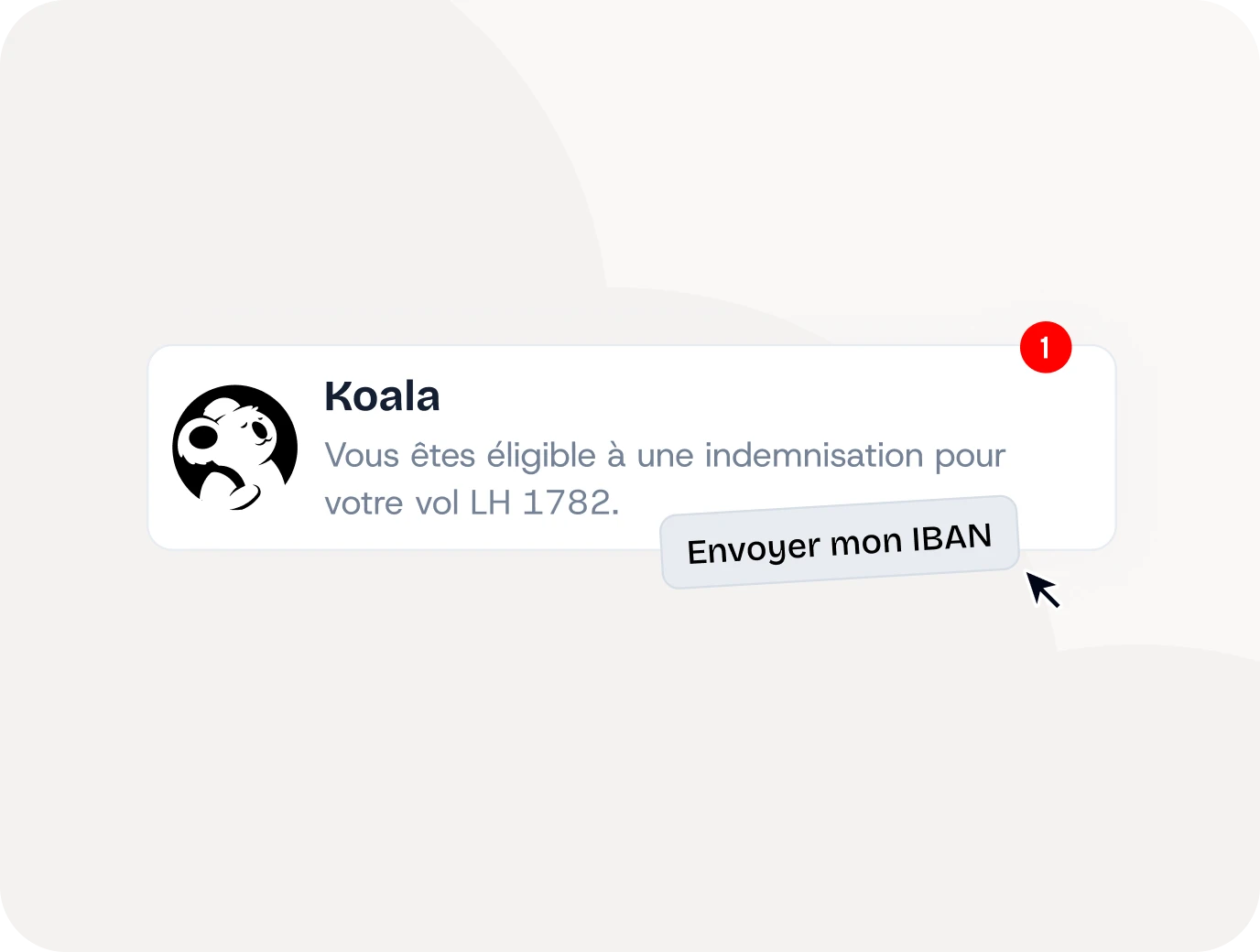 Koala contacte proactivement le voyageur pour l'informer qu'il est éligible à une compensation. Le voyageur est simplement invité à fournir ses coordonnées bancaires. Aucun document, aucune justification, aucune preuve requise. Tout le reste est géré automatiquement en arrière-plan.