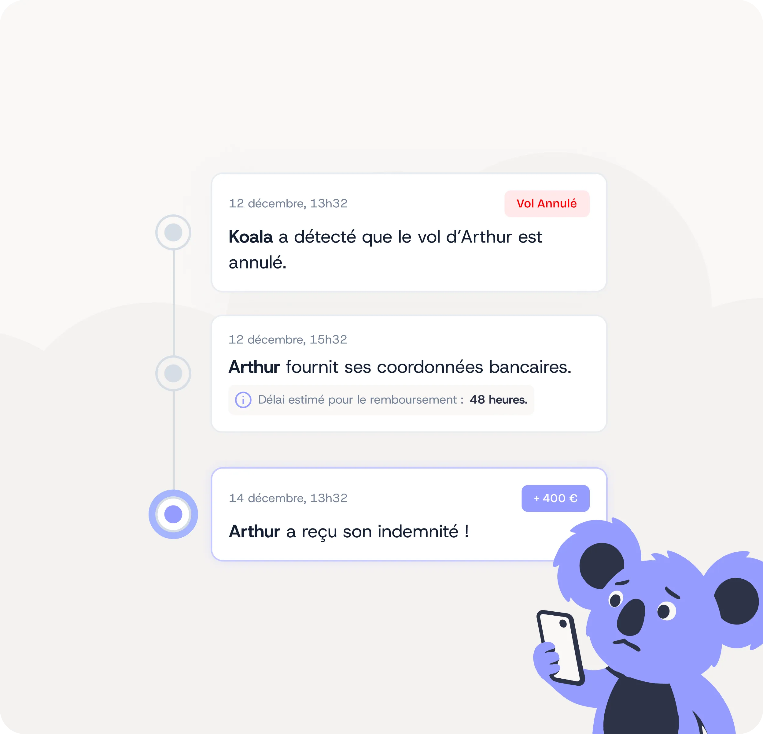 Koala suit les vols en temps réel. Un retard, une annulation ou un déroutement est automatiquement identifié.